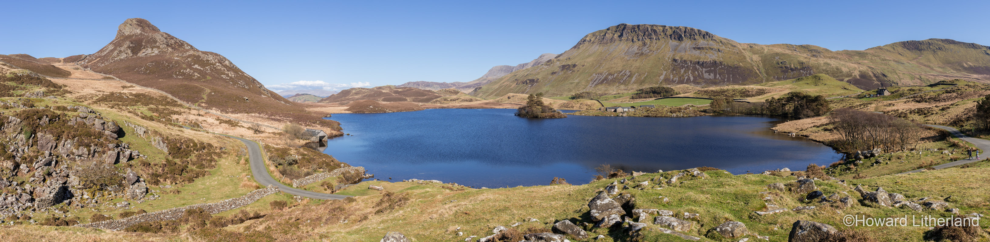 This panoramic view of the larger of the two lakes, with the peaks of southern Snowdonia in the background, was taken from the side of a hill just a few metres from the car park just before we started on our hike.