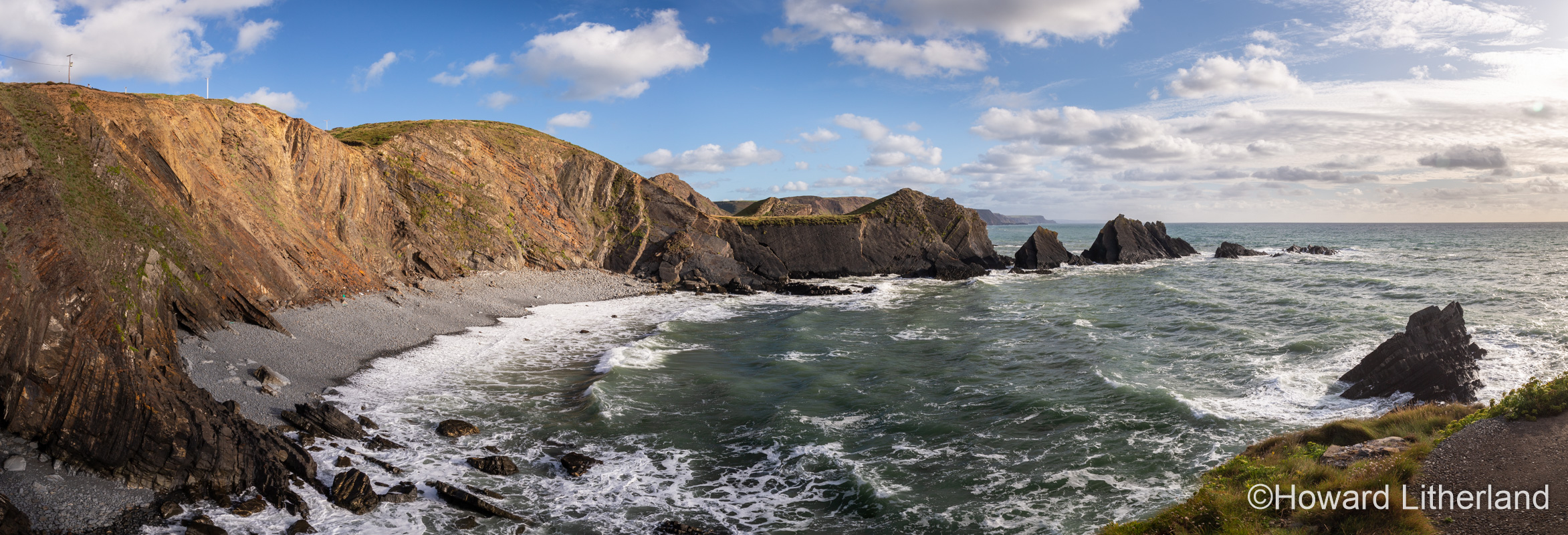 This particular view is from the Hartland Quay hotel car park looking south along the Devon coast and features a dramatic set of sawtooth rocks pointing seawards at high tide on a relatively calm, sunny afternoon.