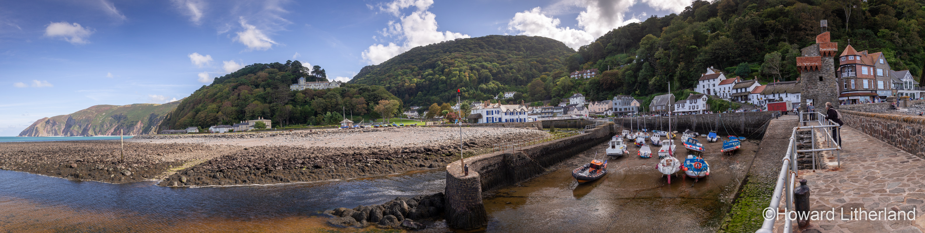 This panoramic collage shows the harbour at Lynmouth and surrounding coastline at low tide, basking in the warmth of a sunny early September afternoon.