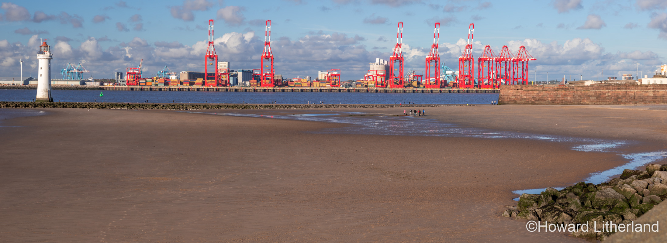 So I took advantage of the opportunity to capture a series of overlapping images in order to create this panoramic collage, taking in not only the cranes but also the New Brighton beach and lighthouse at low tide.
