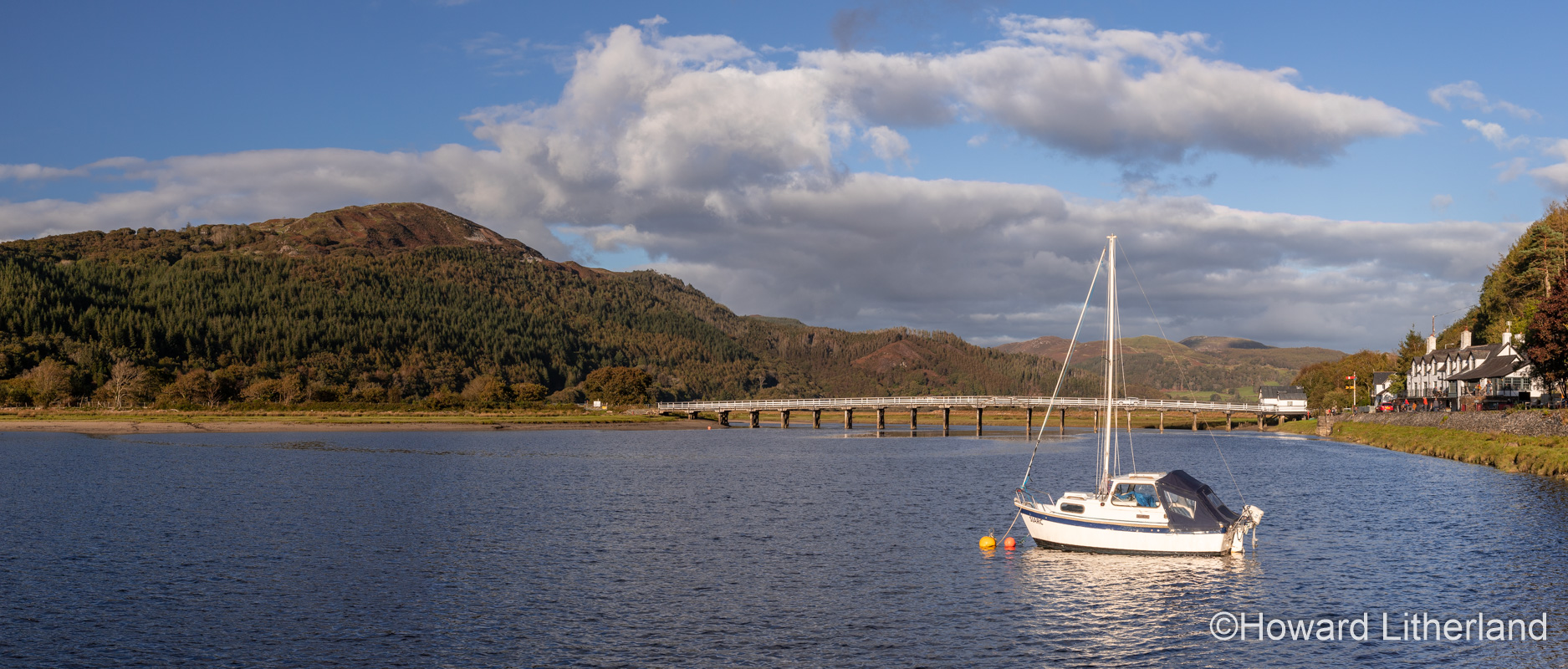 Penmaenpool proved to be a delight, and while we sat in the sun by the riverbank sipping coffees outside the George III pub I just couldn't resist getting my camera out, shooting a variety of time lapse, video, single images and panoramic collages such as this one, taken a few metres downriver from the bridge and featuring a small moored yacht with the foothills of the Snowdonia mountains in the background.