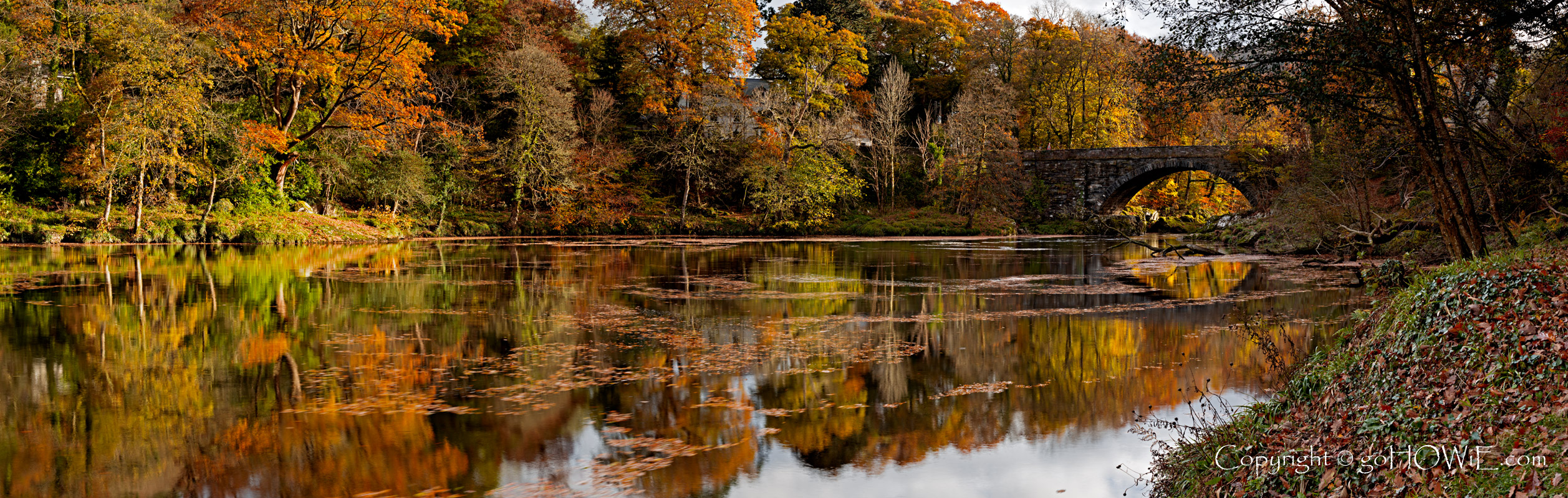 I shot this particular scene on the banks of the river Conwy, just outside Betws-y-Coed near Fairy Glen, on a wonderfully calm afternoon which allowed the tree lined river bank and old stone bridge to reflect in the still waters as rafts of fallen leaves floated by in the golden sunshine.