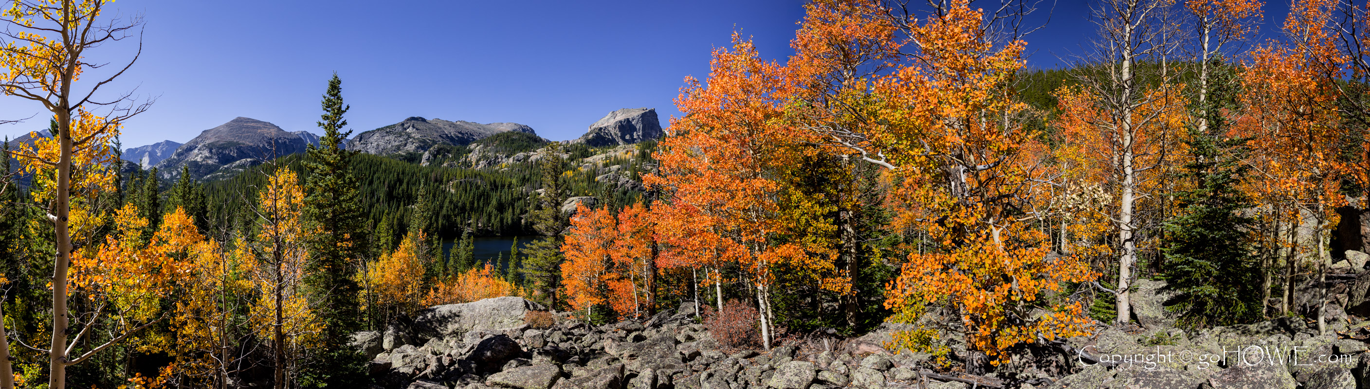 This image shows just one group of tress out of the dozens that we passed, but seeing Hallet Peak in the background, and a glimpse of Bear Lake below, made this view a bit more special, and well worth the time it took to set up and shoot this stitched panorama.