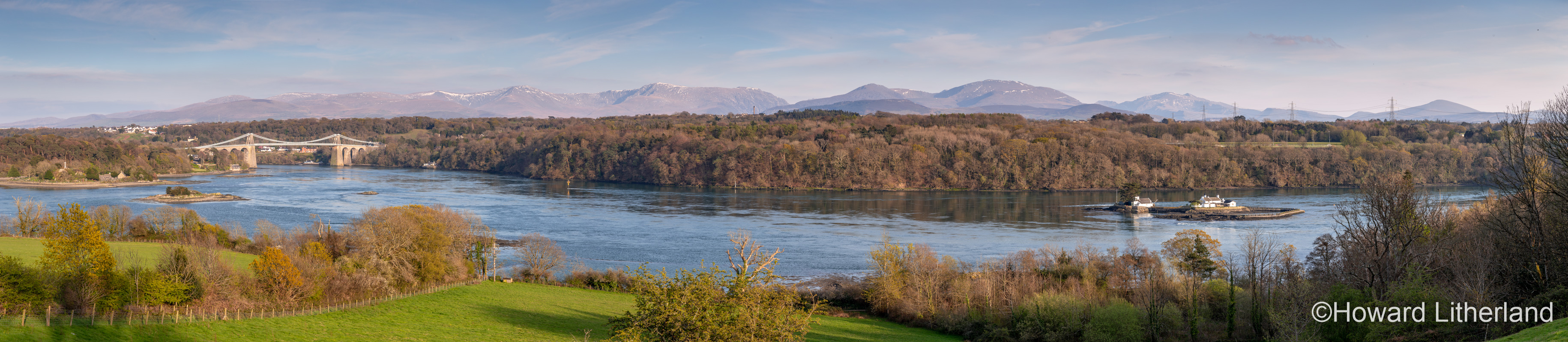 The section of the Menai Straits shown here in this panoramic collage are known as the Swellies, with a fearsome tidal rip and underwater rocks that make this stretch of water one of the most hazardous navigable passages in the world. (According to Lord Nelson that is - and he should know what he's talking about!)