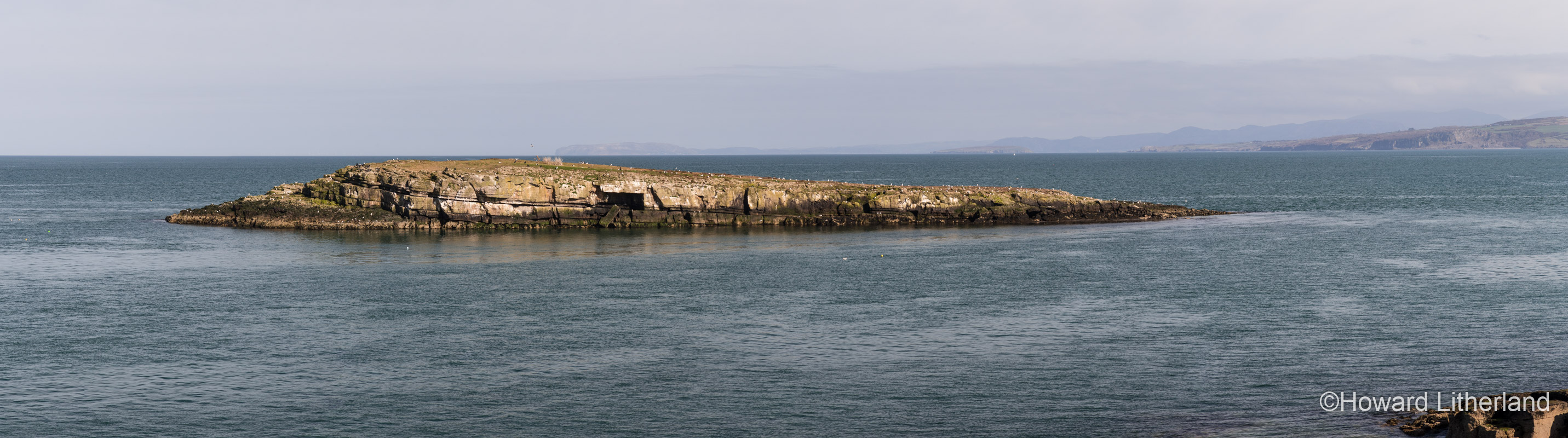 This panoramic view takes in the small Moelfre Island under a lovely blue sky, a haven for seabirds whose calls can be heard echoing over the waters as they wheel around.